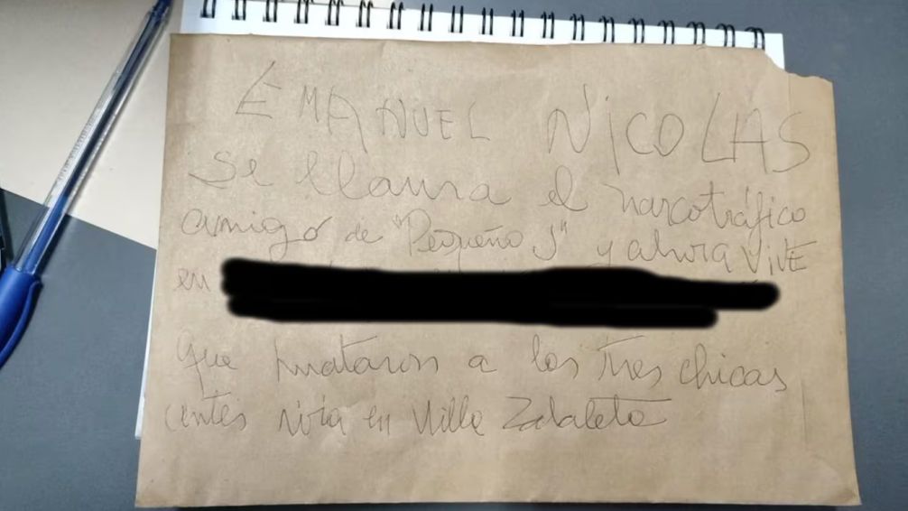El escrito, redactado en un papel madera, advertía: "Emanuel Nicolás se llama el narcotráfico amigo de 'Pequeño J'". También incluía una dirección donde supuestamente residiría actualmente este hombre, además de mencionar que antes vivía en Villa Zavaleta, el barrio de origen de la banda liderada por Tony Janzen Valverde Victoriano.