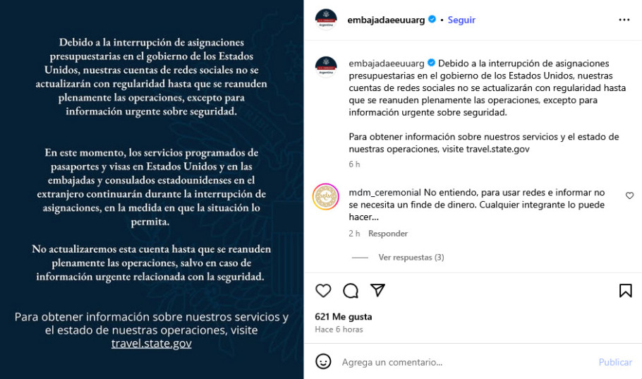 El anuncio confirma que no se trata de un problema técnico ni de una decisión local: la embajada se ve obligada a reducir su comunicación por falta de recursos. De este modo, la diplomacia estadounidense en Buenos Aires se convierte en un ejemplo concreto de cómo la parálisis presupuestaria en Washington repercute de manera inmediata en el exterior.