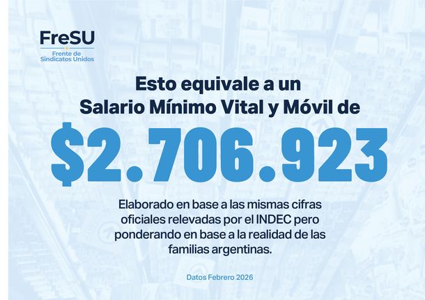 El Frente de Sindicatos Unidos presentó la llamada "Canasta Básica del Hogar Trabajador" y calculó que una familia necesita al menos $2.706.923 por mes para vivir con dignidad en Argentina. El informe cuestiona las mediciones oficiales y advierte sobre una fuerte caída del poder adquisitivo y un creciente endeudamiento de los hogares.