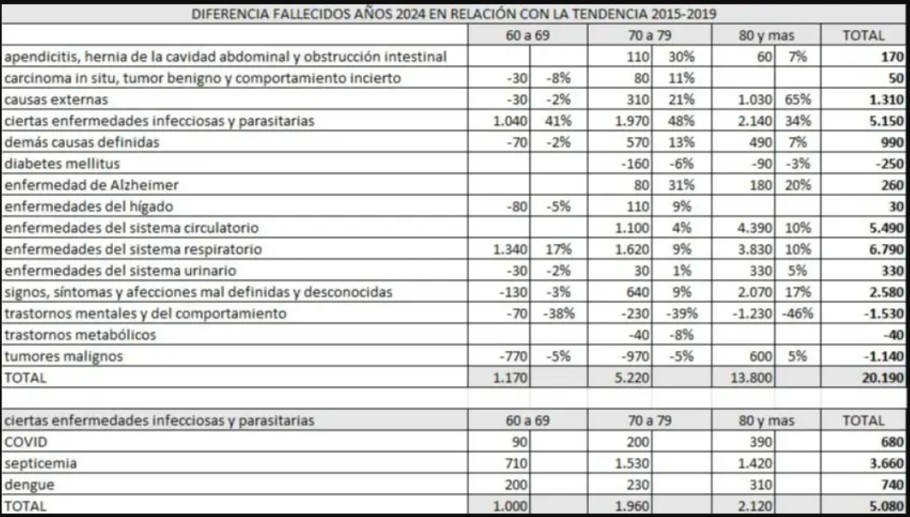 El físico Jorge Aliaga elaboró un informe a partir de datos del Ministerio de Salud de la Nación Argentina que analiza la evolución de fallecimientos entre 2020 y 2024.