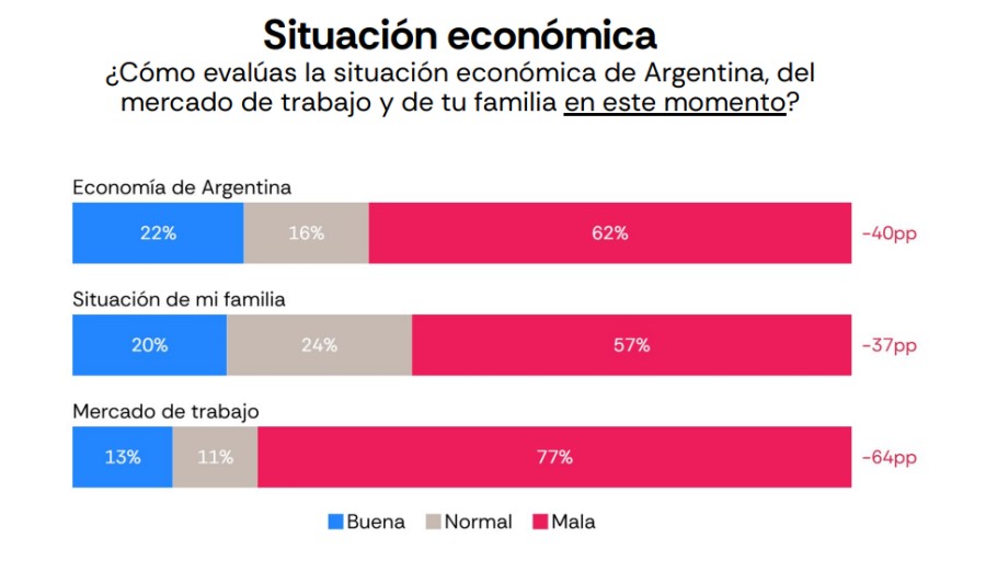 El mercado de trabajo aparece como el aspecto con evaluación más desfavorable. El 77% de los consultados considera mala la situación laboral actual y más de la mitad proyecta un deterioro del empleo en el corto plazo.