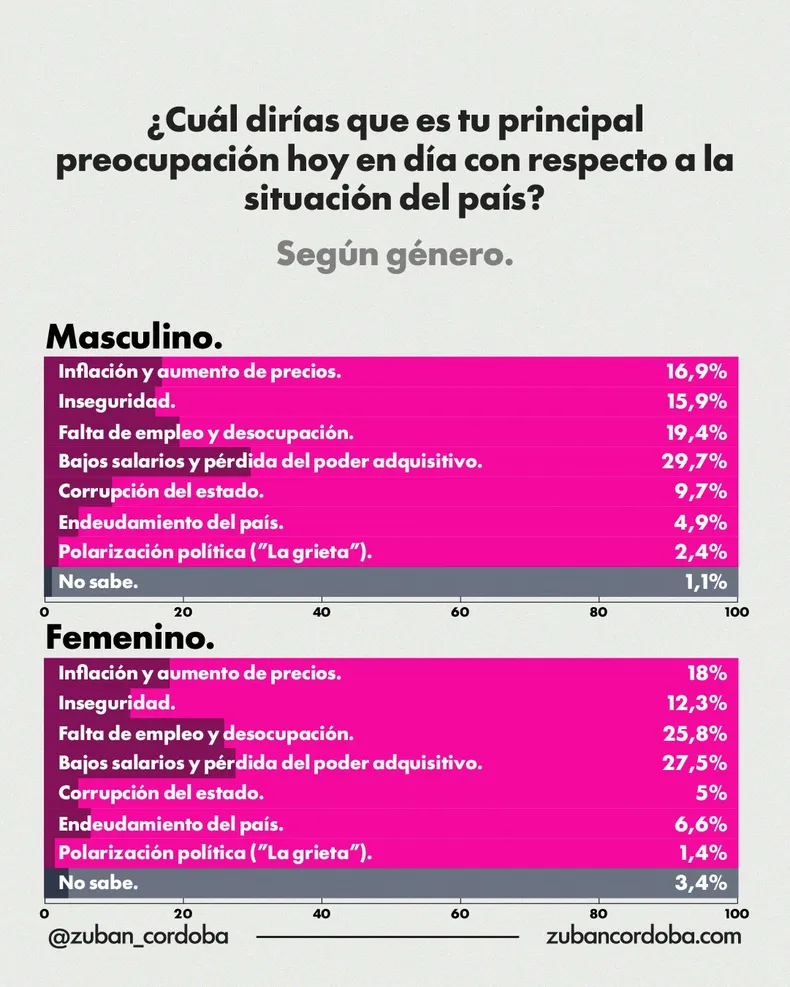 La diferenciación por género muestra coincidencias en torno a los bajos salarios como principal inquietud. Sin embargo, la falta de trabajo fue señalada por el 25,8% de las mujeres frente al 19,4% de los hombres.