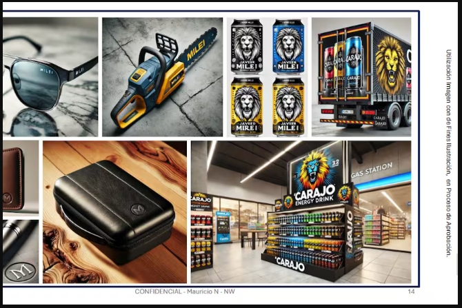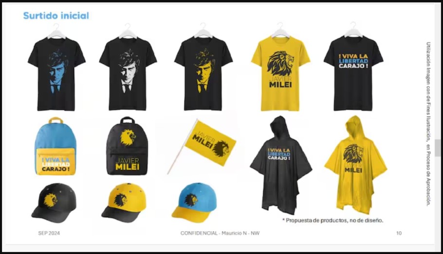 Una de las propuestas planteaba construir una marca integral basada en la figura presidencial. El plan incluía remeras, gorras, mochilas, banderas, ponchos impermeables, lentes de sol, billeteras y bebidas energizantes.