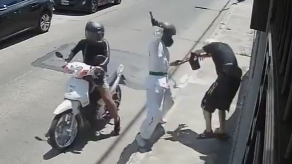 El robo quedó registrado por las cámaras de seguridad de la cuadra y ocurrió pasadas las 14:00. Las víctimas, un hombre de 81 años y su esposa de 74, caminaban tranquilamente por la vereda cuando la moto subió parcialmente a la acera para abordarlos.